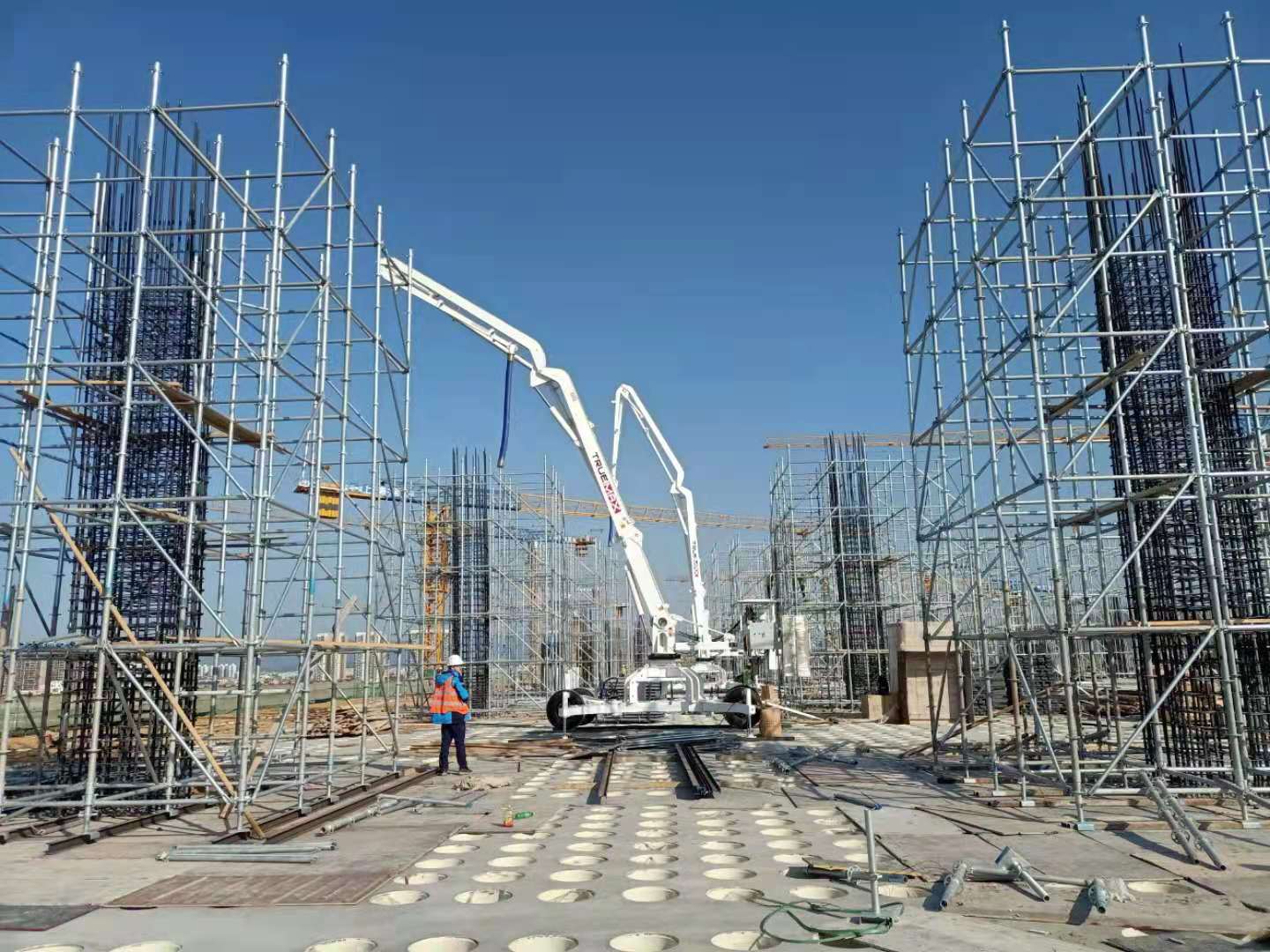 臂架分為三節(jié),全液壓驅(qū)動(dòng),折疊、展開靈活方便,并且可360°回轉(zhuǎn),布料范圍廣。 (2)可選擇無(wú)線遙控,或有線遙控操作方式,操作輕松方便。